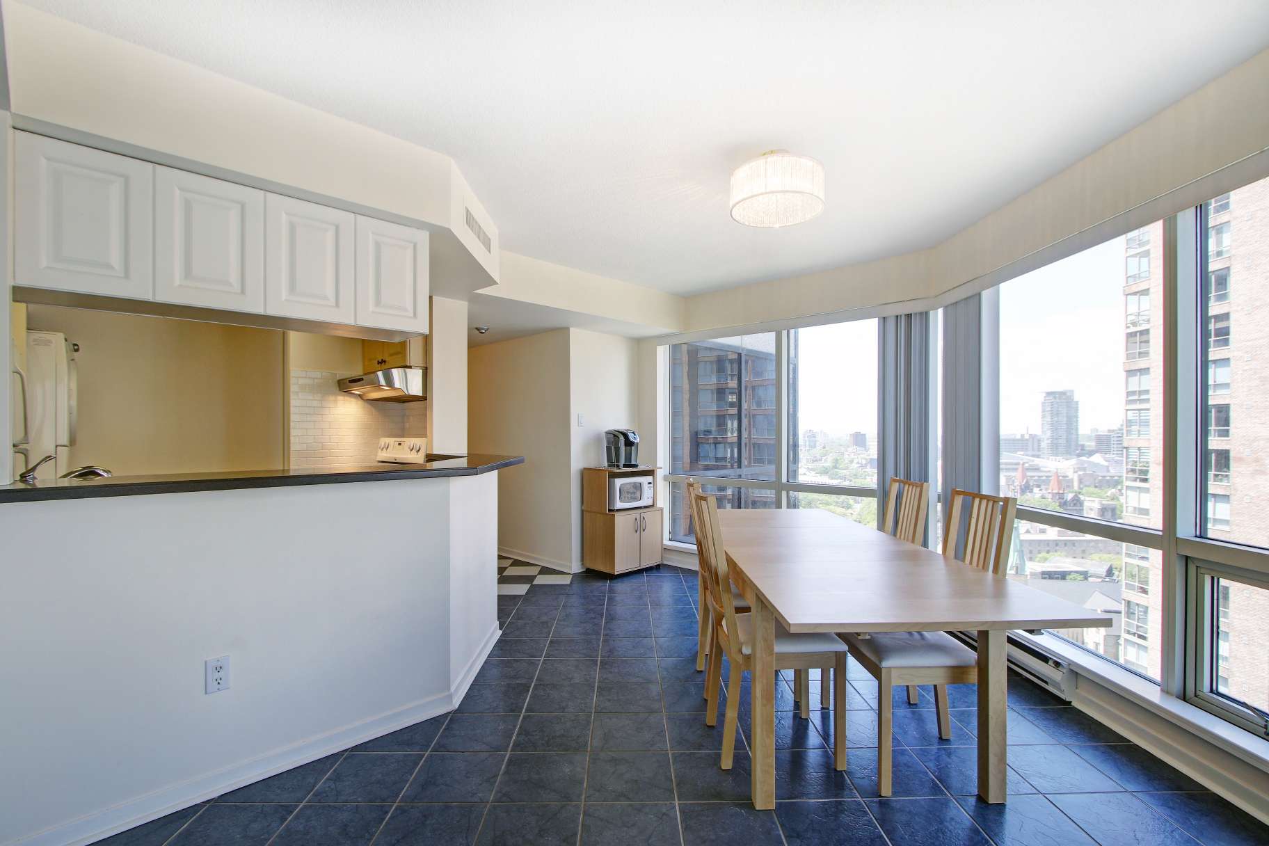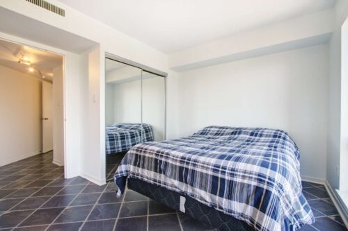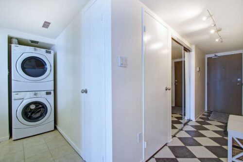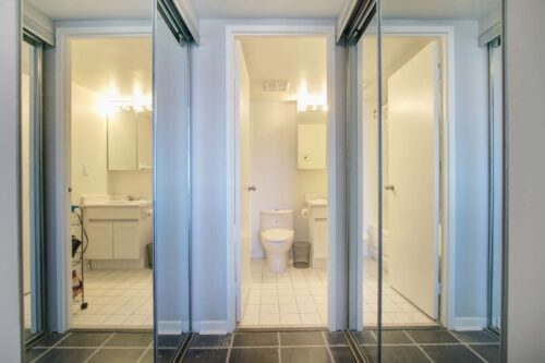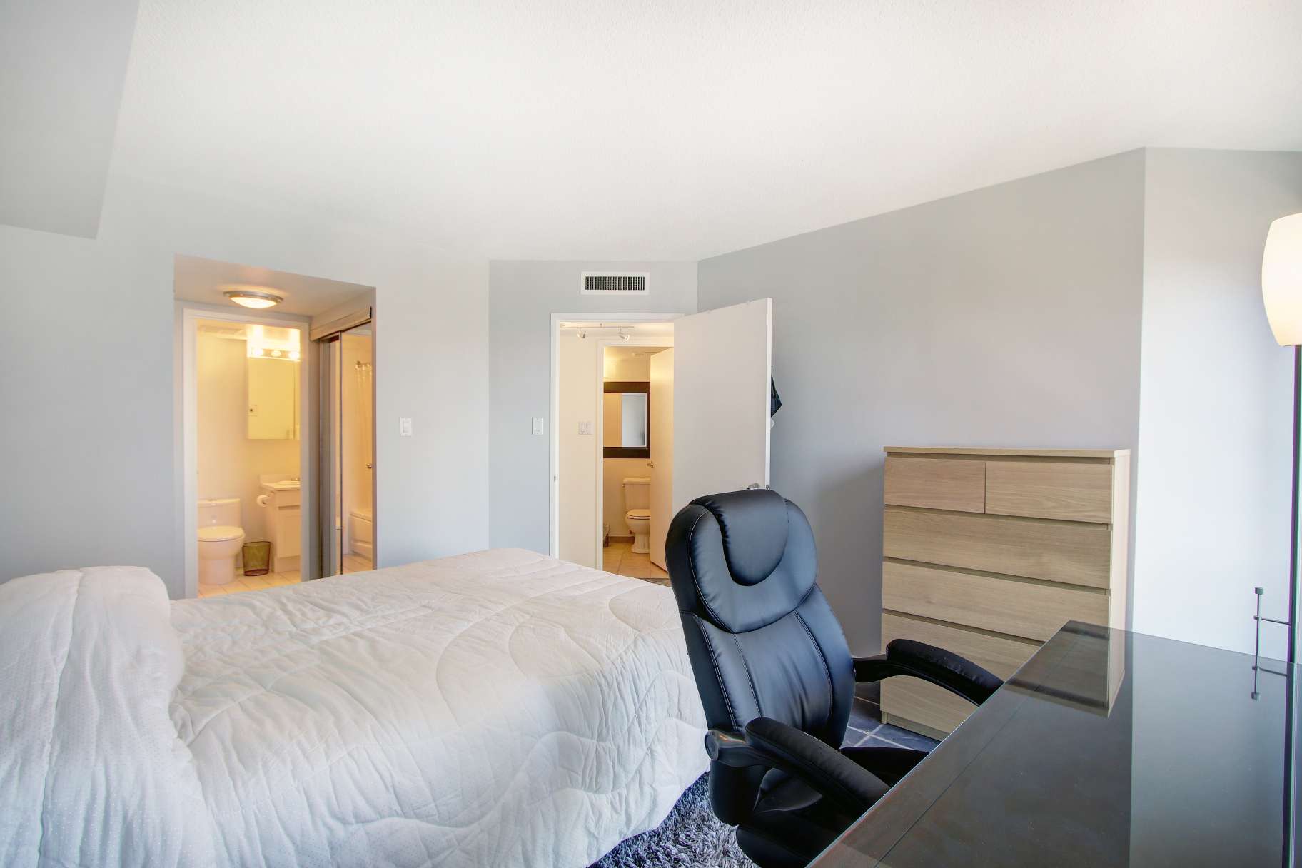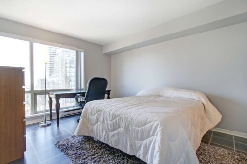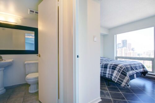 The open-concept living area is both functional and inviting, with ample room to comfortably accommodate a full dining table, a generous living room setup, and a perfectly positioned home office tucked beside the windows-ideal for enjoying the skyline while you work. The bedrooms are thoughtfully set apart down a private hallway, creating a quiet and restful retreat. The primary bedroom features double mirrored closets and a 4-piece ensuite, while the second bedroom enjoys convenient access to a newly renovated 3-piece bathroom just outside the door, perfect for guests or shared living.