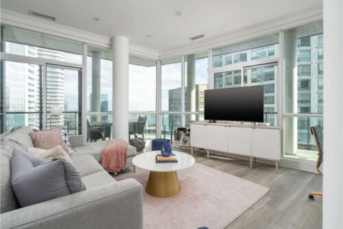 Welcome to Pinnacle Centre, where waterfront living meets downtown convenience. This beautifully updated 2-bedroom (plus private den) and 2-bathroom corner suite offers over 1,200 square feet of bright interior living space with rare 10-foot ceilings and an oversized wraparound terrace. It is located on the coveted top floor and features southeast exposure, flooding the home with natural light throughout the day, while the terrace extends your living and entertaining space. The kitchen and open-concept living area are perfect for hosting, featuring newly upgraded granite counters, a refreshed backsplash, quality stainless steel appliances and a Marvel wine fridge. The primary bedroom is a true escape with a huge walk-in closet and a full 6-piece ensuite washroom.