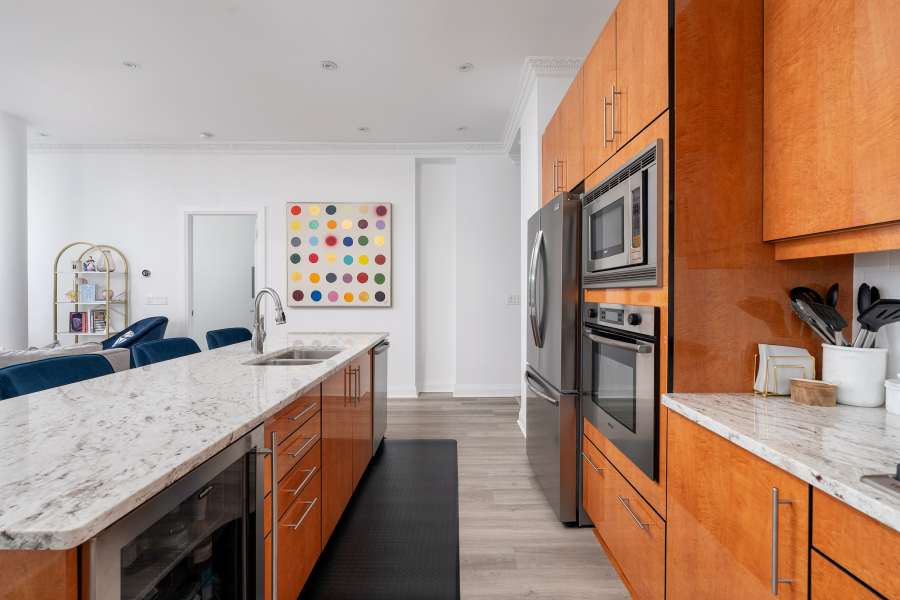 Welcome to Pinnacle Centre, where waterfront living meets downtown convenience. This beautifully updated 2-bedroom (plus private den) and 2-bathroom corner suite offers over 1,200 square feet of bright interior living space with rare 10-foot ceilings and an oversized wraparound terrace. It is located on the coveted top floor and features southeast exposure, flooding the home with natural light throughout the day, while the terrace extends your living and entertaining space. The kitchen and open-concept living area are perfect for hosting, featuring newly upgraded granite counters, a refreshed backsplash, quality stainless steel appliances and a Marvel wine fridge. The primary bedroom is a true escape with a huge walk-in closet and a full 6-piece ensuite washroom.