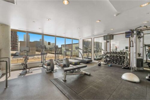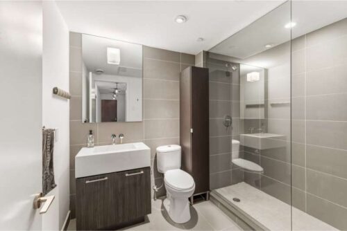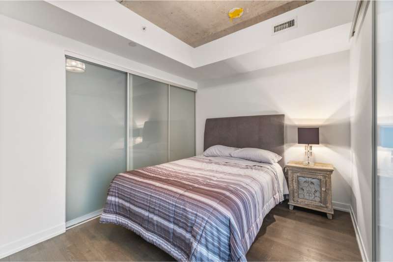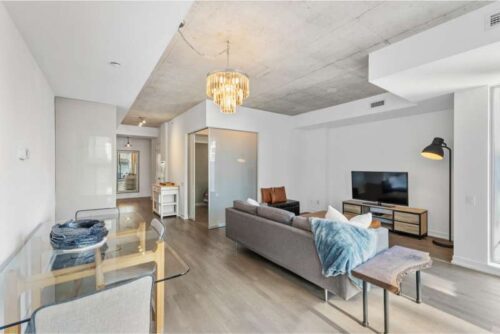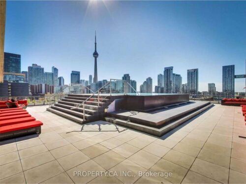 The bedroom can be opened up to create a larger living space and offers wall-to-wall closets. The modern kitchen is equipped with six stainless steel appliances, blending function and design seamlessly. Step outside and experience one of Toronto’s most iconic rooftop amenities – the breathtaking glass pool overlooking the entire city skyline. It’s the ultimate summer escape right at home.